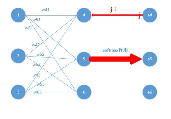 其中y代表我们的真实值,a代表我们softmax求出的值。i代表的是输出结点的标号!在上面例子,i就可以取值为4,5,6三个结点(当然我这里只是为了简单,真实应用中可能有很多结点)