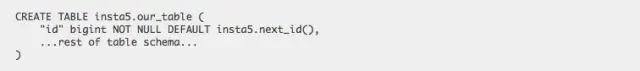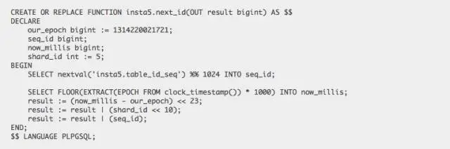 我们通过使用PL/PGSQL, PostgreSQL内部的编程语言,和PostgreSQL现有的自增功能来生成ID。