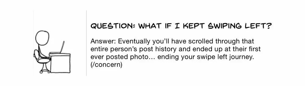 例如,如果指示器在中间。你将知道这不是最新的post所以你可以向左滑来看最新的posts。如果指示器在最左端,你能够安心确保你现在在看这位用户最新的post。如果想看更旧的posts,一直左滑就好了。