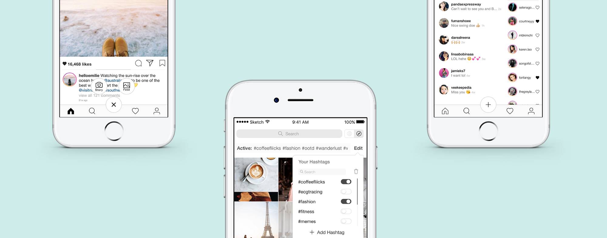 为了简洁我在这篇文章之外留下了我的草图和线框图,但是还是欢迎你访问这里(https://www.kimthuytu.com/instagram-ios-redesign/#sketches)。