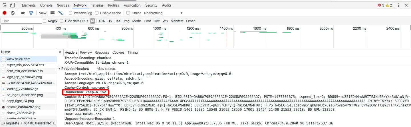 Connection:keep-alivekeep-alive是通知服务器,在这个HTTP Request/Responset结束后,不要立即断开TCP连接(注意是TCP连接,和HTTP没有关系),后面的HTTP Request仍然可以通过这个TCP连接继续传送。