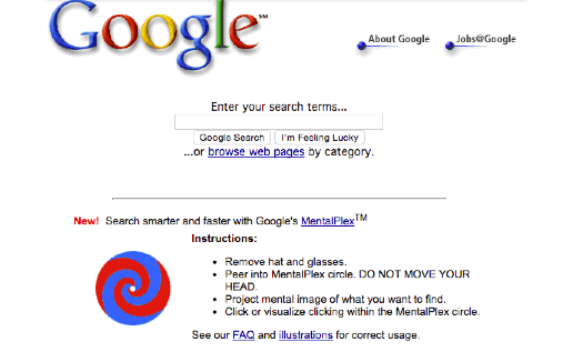 Google 宣布推出意念搜索(MentalPlex),用户只需仔细盯着一个漩涡 GIF 动图,心里想着要搜索的内容,点击漩涡即可完成搜索。