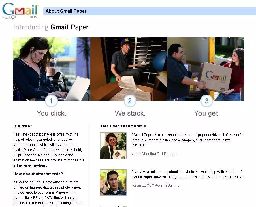 Google 推出 Gmail Paper 服务,这是一项不需要花一分钱就可以把您 Gmail 邮箱里的所有邮件打印出来的特殊服务,不过每份文件背后都会印有广告。
