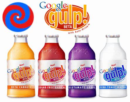Google 推出 Google Gulp 饮料,共有 4 种口味:β-胡萝卜、糖-自由基、谷氨酸葡萄以及血清奎宁水。 饮用后,可以增加饮用者的智力,优化 Google 搜索引擎的使用。该提升是通过实时分析用户的 DNA 来调整大脑中的神经递质。