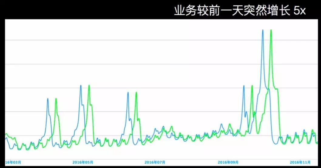 旅游出行的特点是季节性的,在平时流量都比较低,但节假日前一天流量会突然增高很多。因此每到节假日就会面临成「倍」增长的扩容需求。图 1 中可以明显的看到流量的起伏情况。