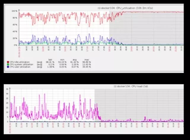 如图 7,可以观察得到前段抖动非常厉害(如果过渡频繁地创建删除容器,会带来非常大的负担,抖动会非常高),在用 1:1 调度之后就变得平缓了。所以携程自定义 CExecutorr(Go 语言实现),避免过于频繁创建删除容器,带来的副作用(抖动非常强、load非常高),之后就基本上处于水平线了。