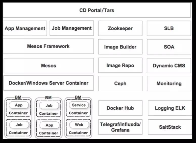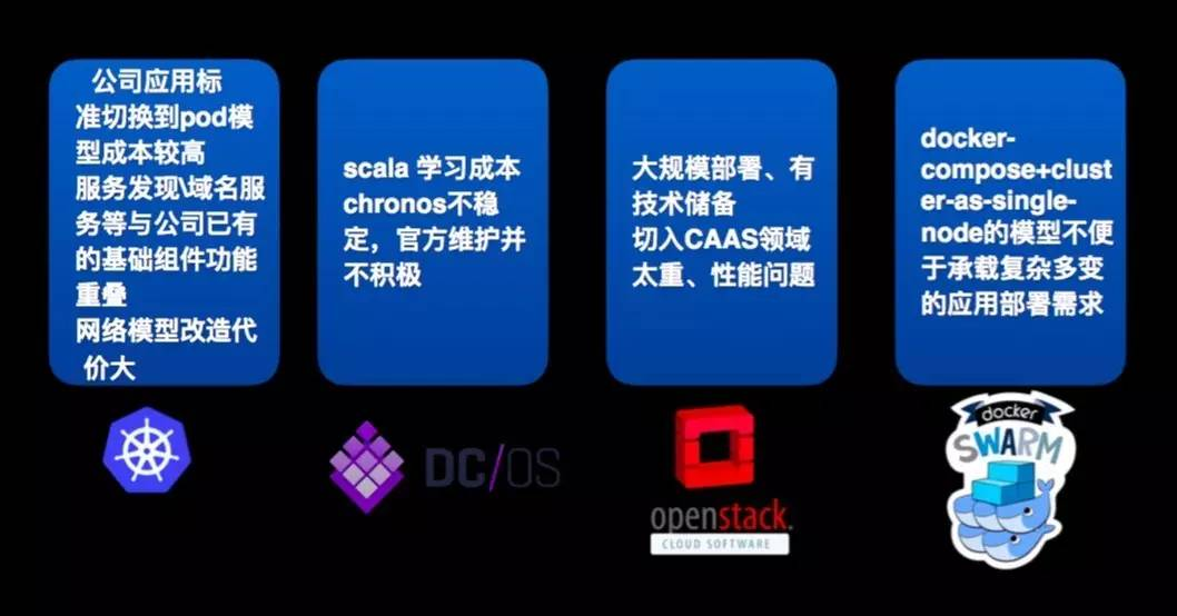 我们早期的胖容器(把容器当 VM 来使用,做代码包发布)的确是用 OpenStack 来做的,原因是我们希望把注意力放在容器本身,以最低的代价将容器先用起来,积累开发、运维经验;而到了瘦容器阶段(基于容器镜像做发布),我们发现 OpenStack 整体的设计理念从本质上讲还是为虚拟机隔离粒度的虚拟化方案设计的,而容器本身与vm其实差别很大,玩法也相去甚远, 于是我们对 Mesos/Kubernetes 进行评估。