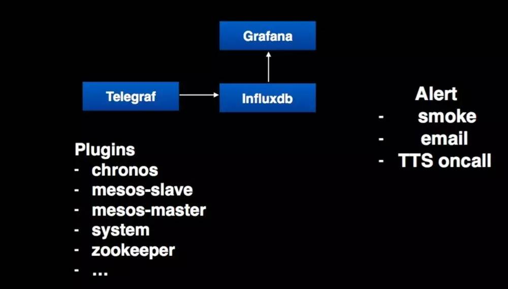 如图 8-9 携程用了很多开源技术,Telegraf、InfluxDB、Grafana 并做了一些扩展来实现 Mesos 集群的监控,采集 mesos-master 状态、task 执行数量、executor 状态等等,以便当 Mesos 集群出现问题时能第一时间知道整个集群状态,进而进行修复,此外, 我们还从 Mesos 调度入手,做了一些应用层的监控,比如:针对cron job类型的应用,让用户可以看到 job 应该在什么时候执行,执行的过程,整个 job 的成功率,job 还有多个实例在跑等。