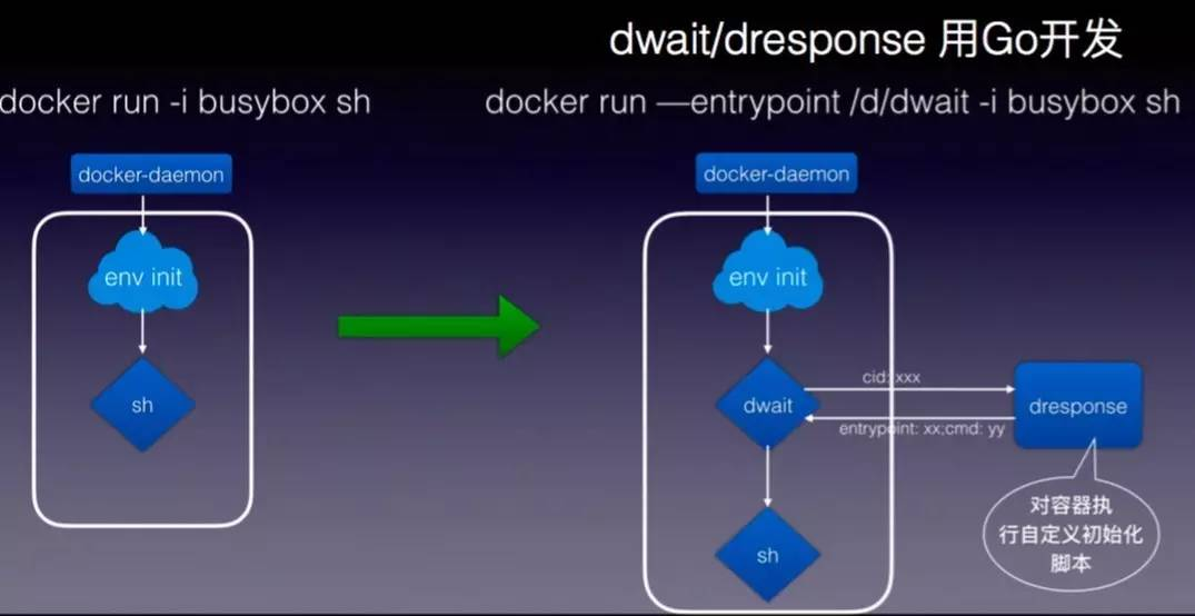 如图 5 用dwait 和 dresponse,基于 Go 开发,dwait 会通过 unix socket 请求外部服务 dresponse 做容器的初始化。当这个容器起来的时候,它的网络没有那么独立,在 Docker 里面是需要依赖外部提供信息的,所以需要知道哪个网段或者说创建的 neutronport 再配置到 Docker 容器内。这样做后就不会有网络丢失的情况。