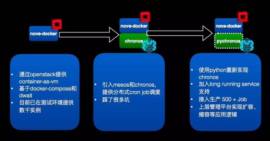 第一阶段,需要最快的使用起来,用最熟悉的技术来解决部署和调度。到了第二阶段有新的需求,引入 Mesos 和 Chronos,提供分布式 cron job 调度。第三阶段是使用 Python 重新实现 Chronos,并且单独实现了 CExecutor 等组件。