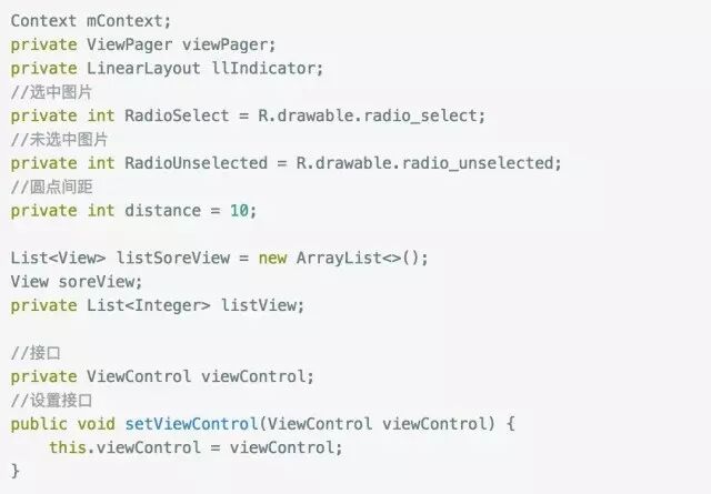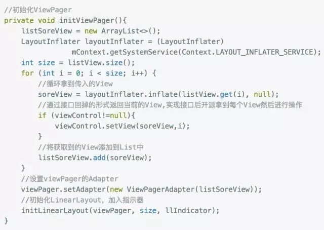 因为之前调用了setView方法,传入了一组布局,我们通过循环来拿到这组View并添加到list中,然后设置到viewPager的Adapter,然后调用initLinearLayout方法初始化指示器。