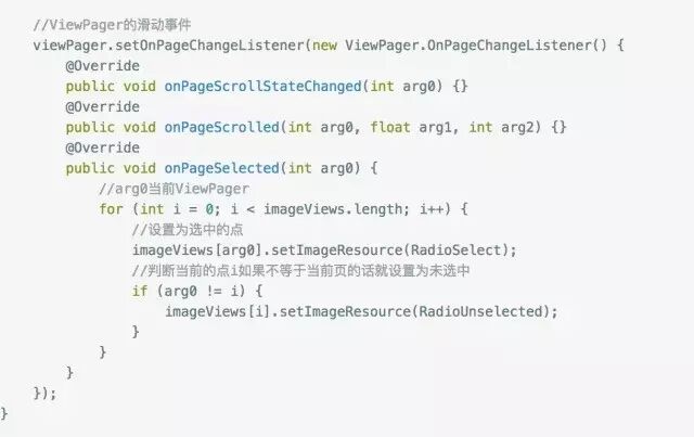 我们对ViewPager设置了监听事件setOnPageChangeListener,在滑动的时候会调用onPageSelected,在这里可以拿到当前页,之后我们通过循环刚刚的数组,将当前页对应的点设置为选中图标,不等于当前页的设置为未选中的点。