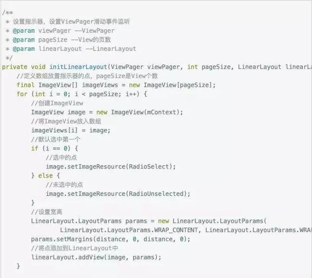 定义了一个数组,用来放置指示器的点,通过循环pageSize来动态创建ImageView,然后判断i来将第一页的ImageView设置为选中的点,其余设置为未选中的点。接着设置了宽高,然后添加到LinearLayout中。