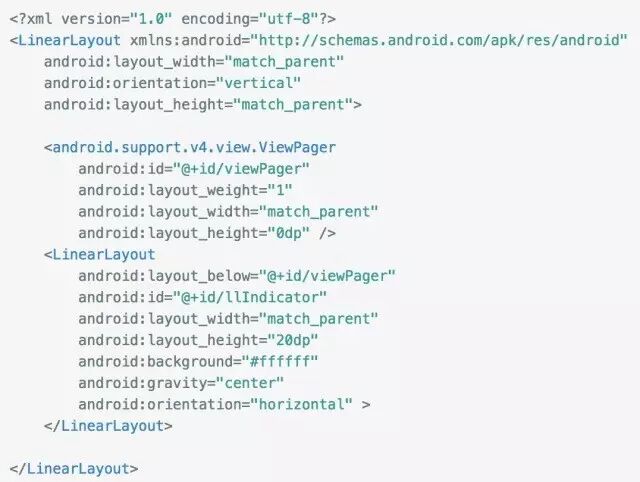 和普通的布局没啥区别,外层LinearLayout垂直布局,其中有ViewPager作为滑动切换的容器,内部的LinearLayout作为指示器容器。