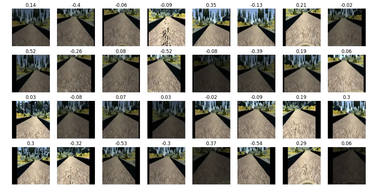 首先操作这辆汽车,类似于玩赛车游戏,过程中会事实记录你的照片,例如上图,以及照片对应的车辆角度。而后你的训练数据就是照片,目标就是角度。最后运行你的训练模型,得出车辆的角度,小车就自己跑起来拉。