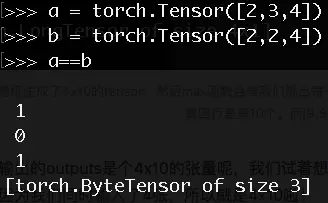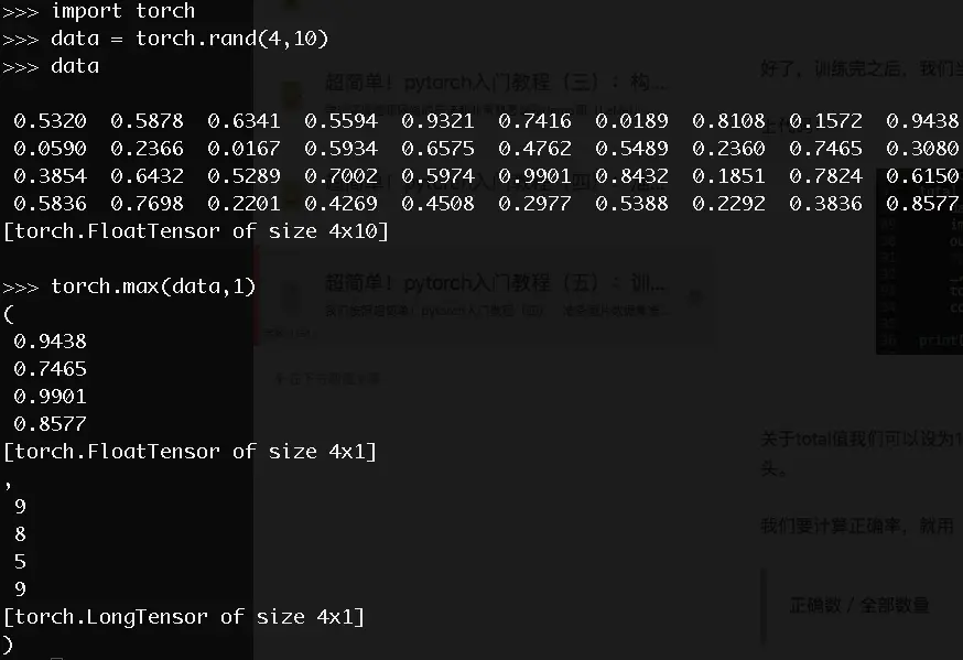 我解释一下第92行代码,outputs.data是一个4x10张量,max函数会将每一行的最大的那一列的值和序号各自组成一个一维张量返回,第一个是值的张量,第二个是序号的张量。我想还是举个例子吧: