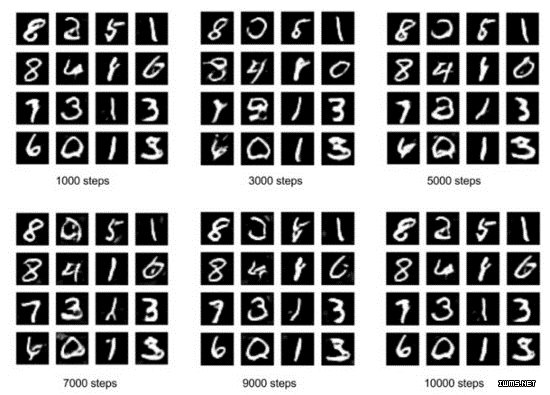 下图展示了在训练过程中,整个模型的输出变化情况。可以看到,GAN 在自己学习如何生成手写体数字。