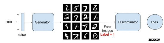 如图所示,对抗模型的基本结构是判别器和生成器的叠加。生成器试图骗过判别器,同时从其反馈中提升自己。如下代码中演示了如何基于 Keras 框架实现这一部分功能。其中,除了学习速率的降低和相对权值衰减之外,训练参数与判别器模型中的训练参数完全相同。