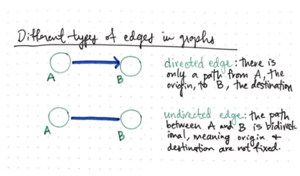 不同类型的边或路径对定义和识别图时非常重要。边的类型实际上是图之间最大、最明显的区别之一。大多数情况下(只有一种例外),图会有两种类型的边:即具有方向或流向的边和不具有方向或流动的边。我们将其称为有向边(directed edges)和无向边(undirected edges)。