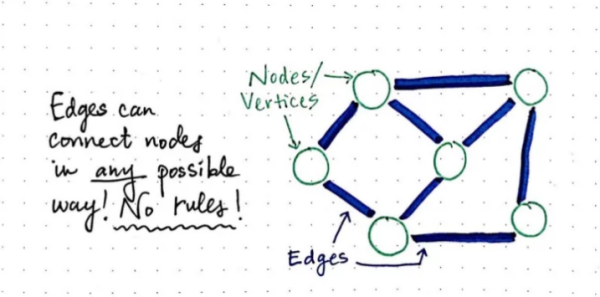在图中,结点和结点之间的连接并没有确切的规则,边(有时候也称为链接)能以任何方式连接结点。