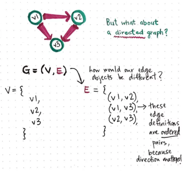 在有向图中,定义结点的方式和无向图中是一样的,但有向边和无向边的定义是不一样的。在有向图中,边的对象定义为有序对(使用圆括弧表示),因为这种情况下,边的方向十分重要。因为在有向图中,边只能是从起始结点到目标结点,所以边必须进行排序,从而定义 E 中有序对前一个元素为起始结点,后一个元素为目标结点。