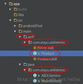 首先我们需要把Product.java放到aidl目录相同名字的文件夹下(如果要提供服务给其他app,最好把需要的对象都放在aidl目录下,这样比较容易拷贝)