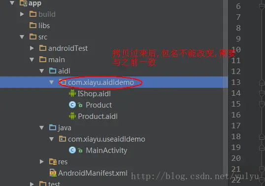 我们需要创建一个新的应用来作为客户端,并且把服务器端的aidl目录下的所有文件都拷贝过来,这里要注意的就是里面的目录不能改变,需要与以前一致