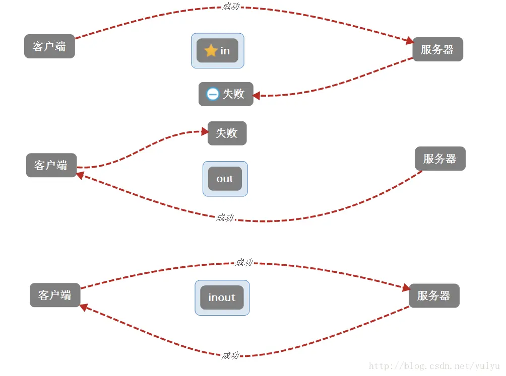 - 3.inout: 能从客户端到服务器,也可以作为返回值从服务器到客户端