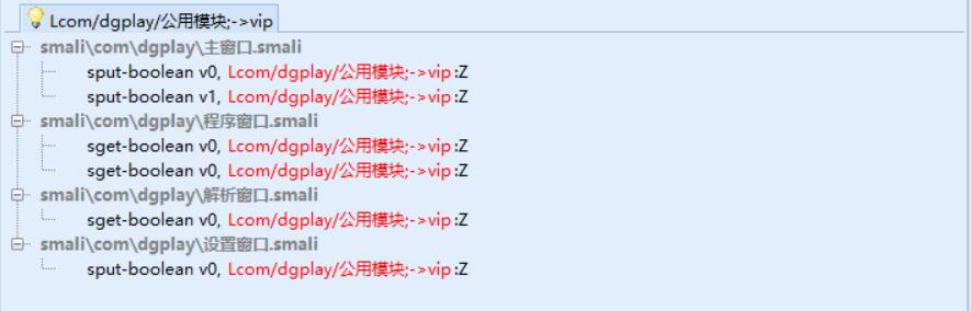但是,在静态构造器中将这个字段赋成 1 是不行的,因为主界面中可能有将它重新赋成 0 的代码。我们搜索Lcom/dgplay/公用模块;->vip,结果如下:
