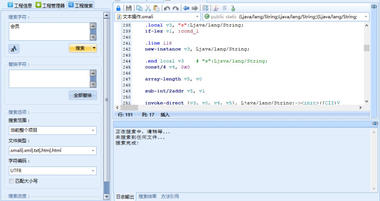 我们直接搜索“会员”,没有任何结果。可见 e4a 直接将字符串硬编码进代码里。