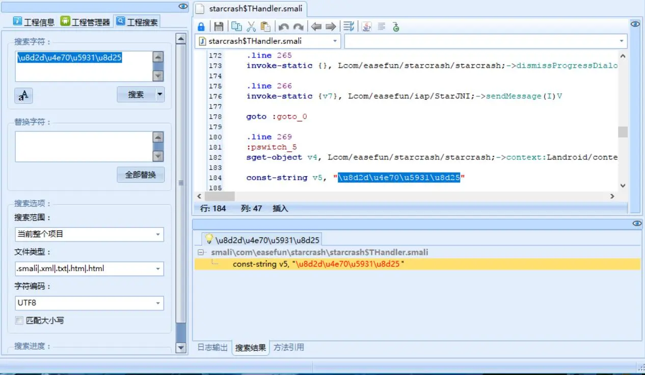 在starcrash$THandler.smali的handleMessage方法中找到了这个文本,这个类是starcrash类中的闭包。