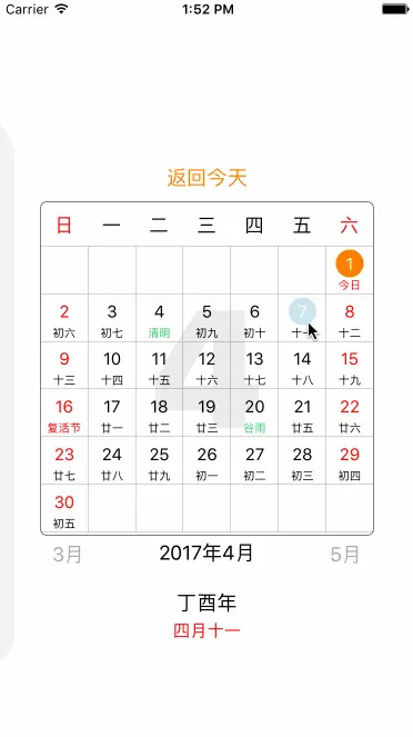 _calendarView.dateColor = [UIColor orangeColor];// 今天日期数字背景颜色