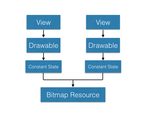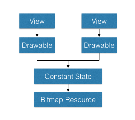 Android 系统为了减少内存消耗,将应用中所用到的相同 drawable (可以理解为相同资源)共享同一个 state,并称之为 constant state。这里用图表演示一下,两个 View 加载同一个图片资源,创建两个 drawables 对象,但是共享同一个 constant state 的场景:
