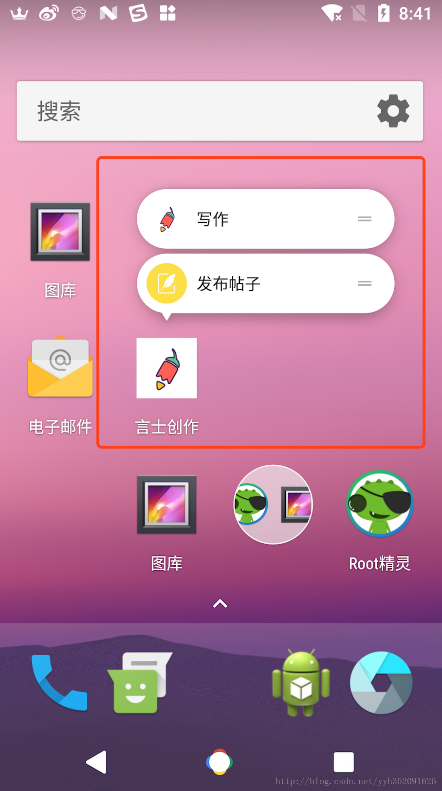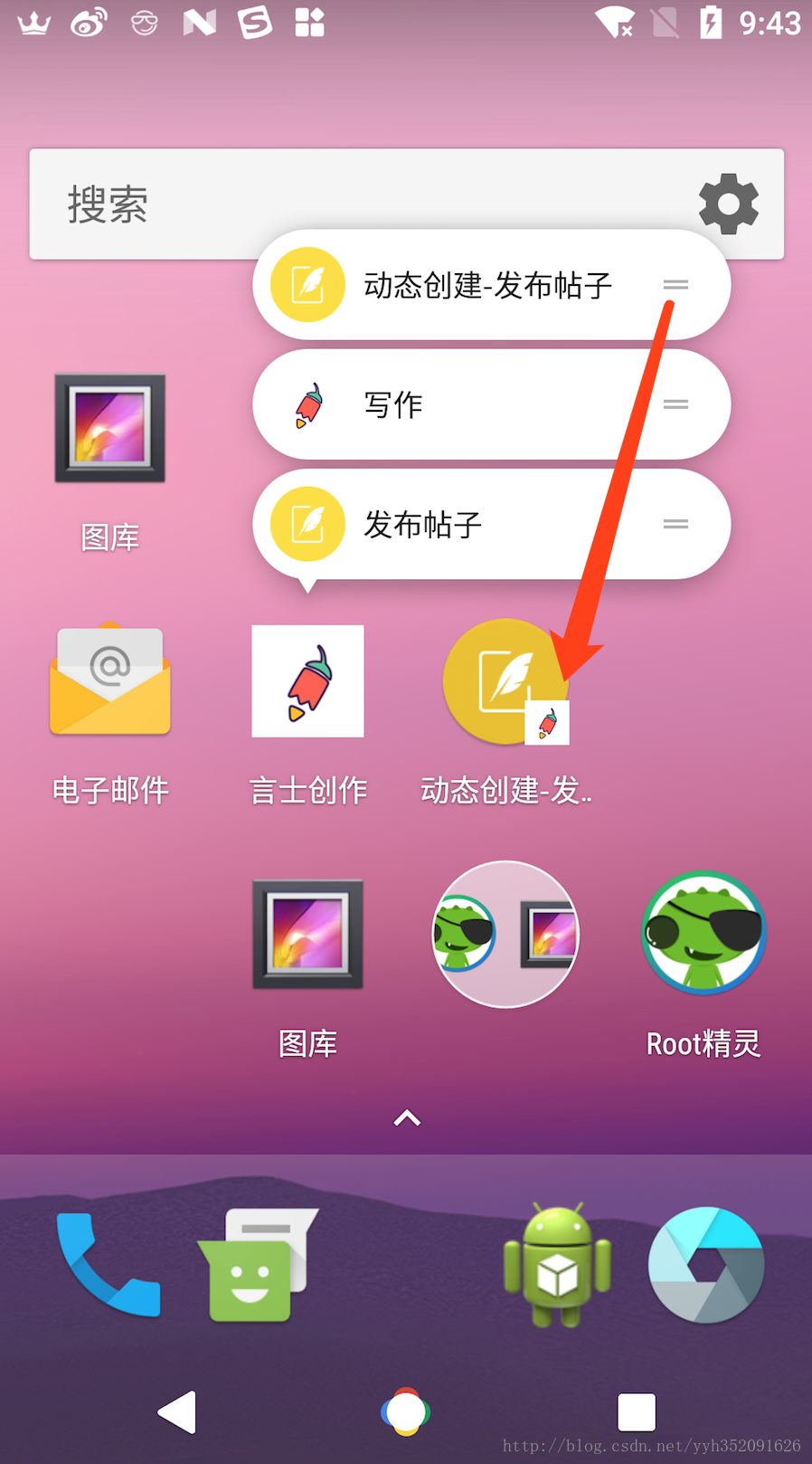 在 AndroidMainfest.xml 的默认启动页里添加meta-data标签配置<activity android:name=".ui.MainActivity" android:configChanges="orientation|screenSize|keyboardHidden" android:screenOrientation="portrait" android:theme="@style/AppTheme.NoneTranslucent"> <intent-filter> <action android:name="android.intent.action.MAIN" /> <category android:name="android.intent.category.LAUNCHER" /> </intent-filter> <meta-data android:name="android.app.shortcuts" android:resource="@xml/shortcut" /> </activity> - 完毕! 可以到桌面查看效果了~~