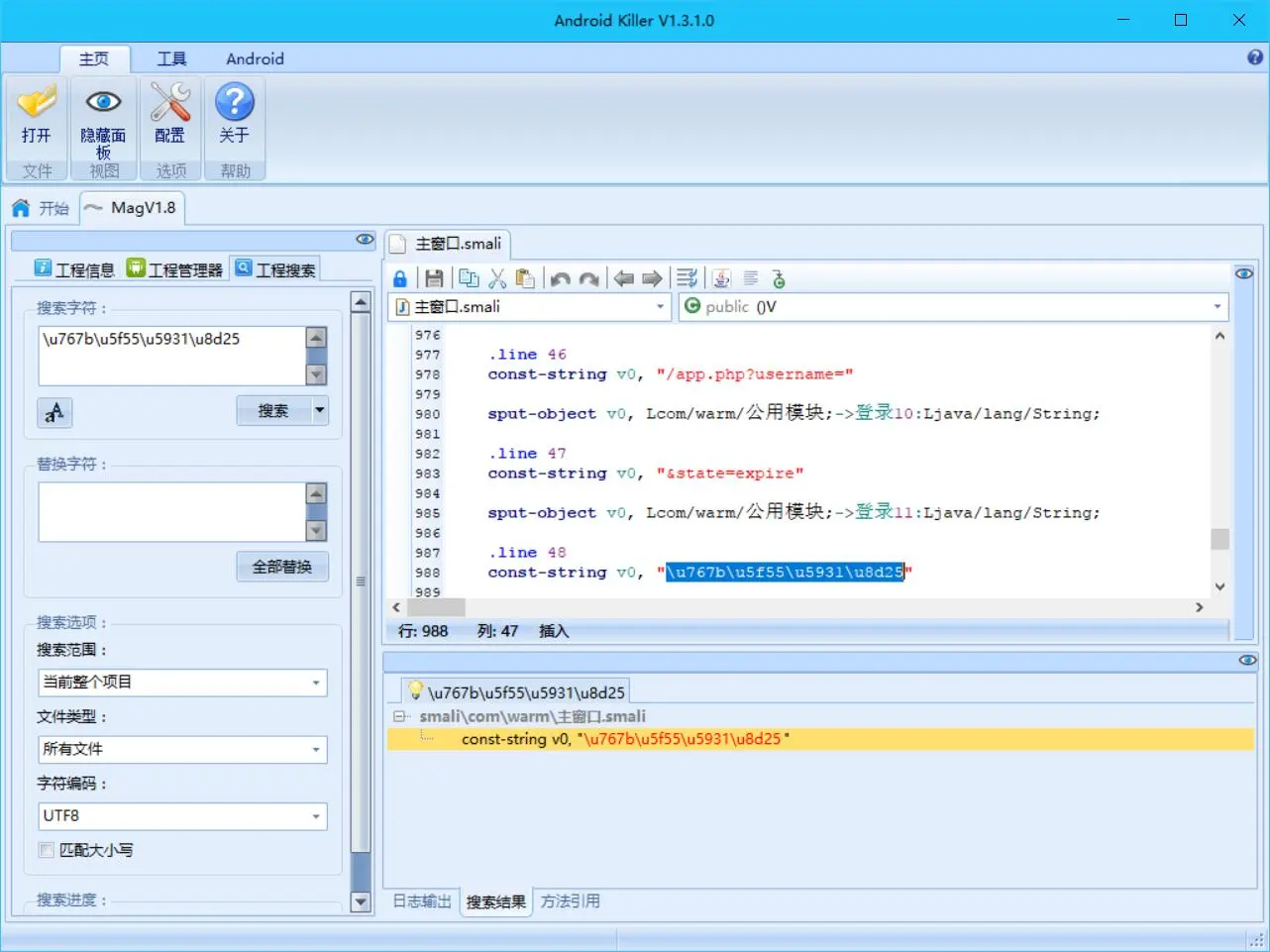 将其载入 AK,搜索“登录失败”,没有反应。搜索它的 Unicode 编码\u767b\u5f55\u5931\u8d25: