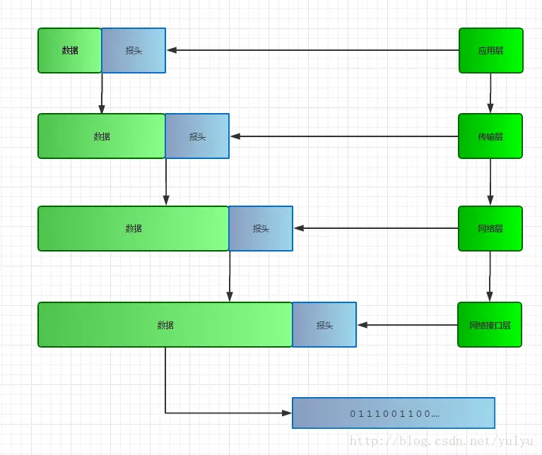 在装包的时候,每一层都会增加一些信息用于传输,这部分信息就叫报头,当上层的数据到达本层的时候,会将数据加上本层的报头打包在一起,继续往下传递.