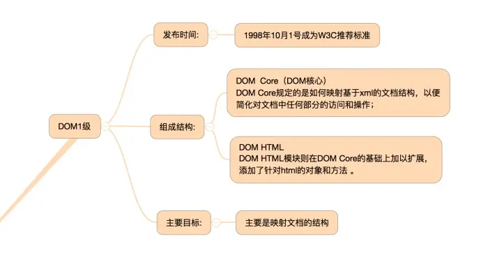 DOM1级主要定义了HTML和XML文档的底层结构。在DOM1中,DOM由两个模块组成:DOM Core(DOM核心)和DOM HTML。其中,DOM Core规定了基于XML的文档结构标准,通过这个标准简化了对文档中任意部分的访问和操作。DOM HTML则在DOM核心的基础上加以扩展,添加了针对HTML的对象和方法,如:JavaScript中的Document对象.