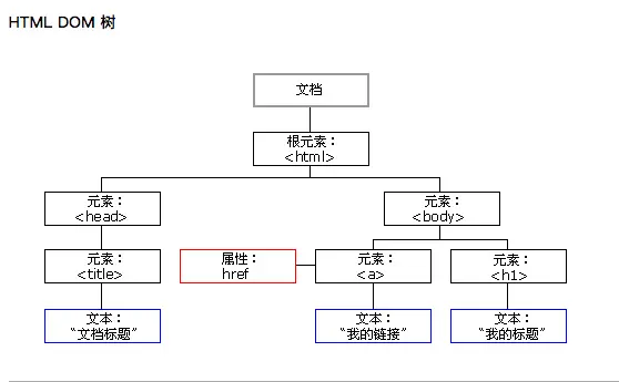 - 属性节点:元素属性,如<a>标签的链接属性href="www.baidu.com"。