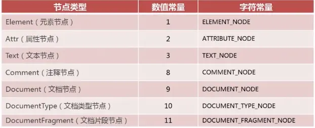 DOM1级定义了一个Node接口,这个Node接口在javascript中是作为Node类型来实现的。除了IE以外,其他所有浏览器都可以访问这个类型。每个节点都有一个nodeType属性,用于表明节点的类型。节点类型通过定义数值常量和字符常量两种方式来表示,IE只支持数值常量。节点类型一共有12种,这里介绍常用的7种类型。如下图: