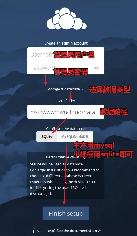 浏览器打开http://127.0.0.1:10010,MariaDB是Mysql的开源分支(mysql被oracle收购了),适合大规模使用,对并发和性能要求比较高的场景。SQLite3适合小规模使用。此处使用SQLite3。详见 doc.owncloud.org/server/late… 和doc.owncloud.org/server/late…