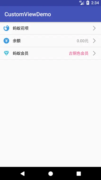 今天就来实践一下简单的自定义View之组合。自定义View这种东西,说难也难,说简单也简单。俗话说得好,纸上得来终觉浅,绝知此事要躬行。看了一下支付宝的界面,觉得有很多地方值得学习,这次就拿一个比较简单的点出来模仿,实现简单自定义View。