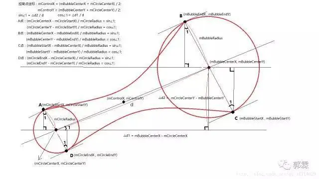 其中绘制两圆间粘连效果的贝塞尔曲线我们需要去计算绘制的起点、控制点和中心点。这里我是参照这篇博文写的,因为初中数学早都忘干净了,实在算不出来。