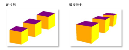 在透视投影下,同样大小的物体,在屏幕下远处的物体会比近处的物体小,而正投影下两者是一样大小的。