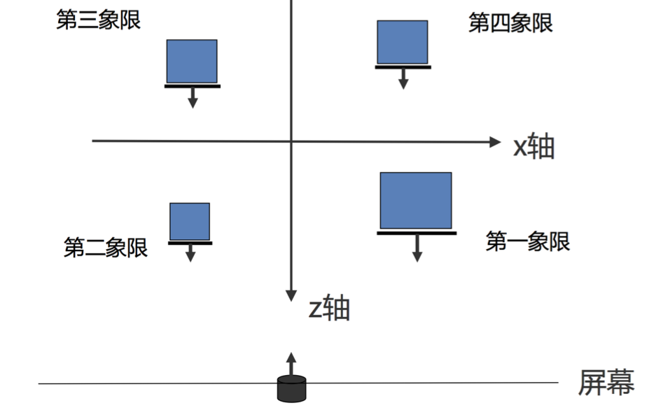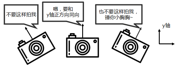 如果从y轴正方向往y轴负方向看,示意图大致是这样子的(蓝色代表正方体,有粗线加箭头的一面代表正方体有图片的正面,黑色的圆柱体代表照相机,箭头指明拍摄方向):