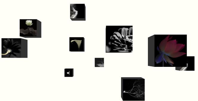在初始化three.js后,创建我们需要的物体,在这里我随机创建了几个正方体,它们的大小和位置都是随机的,面向屏幕的一面加载了一张图片纹理,作为正面,如下图所示: