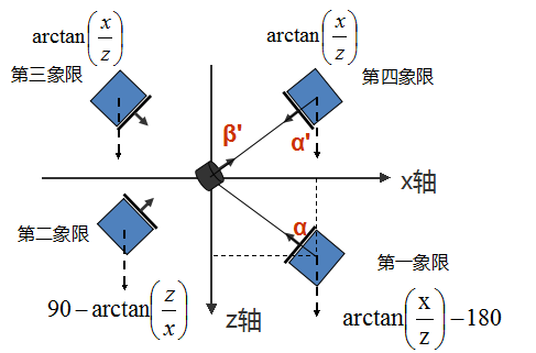 在初始化时,我们便记录了正方体的坐标值(x,y,z),正方体从面向屏幕到面向y轴要旋转多少角度,我这里用了初中数学方法——反三角函数算出。如下图所示分别为四个象限物体需要旋转的角度值。