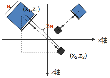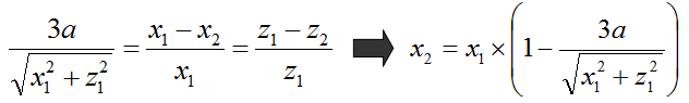 我们已知正方体的边长a,假设照相机与正方体中心点的距离设置为3a,利用相似三角形边长等比例的原理得出照相机的该移到的地方(x2,z2)坐标,公式如下: