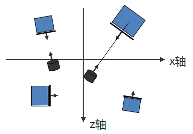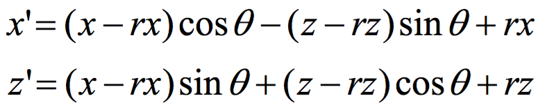 如上图所示,照相机原来是在正方体中心和原点的连线上的坐标(x,z),绕正方体的中心点(rx,rz)旋转随机角度θ后得到的(x',z')的计算公式如下: