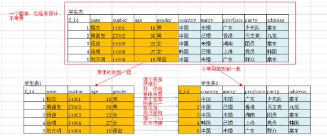 将一个表中常用的数据和不常用的数据分离开来,分别保存,但是使用同样的id进行管理。