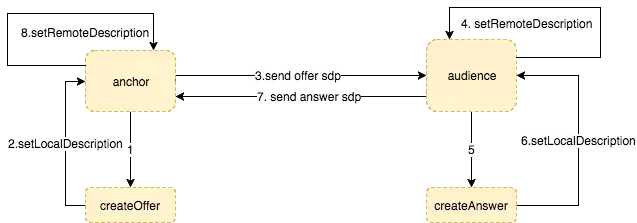 }看上面的代码,大家估计有点迷茫,来点实的,大家可以参考 单页直播。在查看该网页的时候,可以打开控制台观察具体进行的流程。会发现一个现象,即,onaddstream 会在 SDP 协商还未完成之前就已经开始,这也是,该 API 设计的一些不合理之处,所以,W3C 已经将该 API 移除标准。不过,对于目前来说,问题不大,因为仅仅只是作为演示使用。整个流程我们一步一步来讲解下。